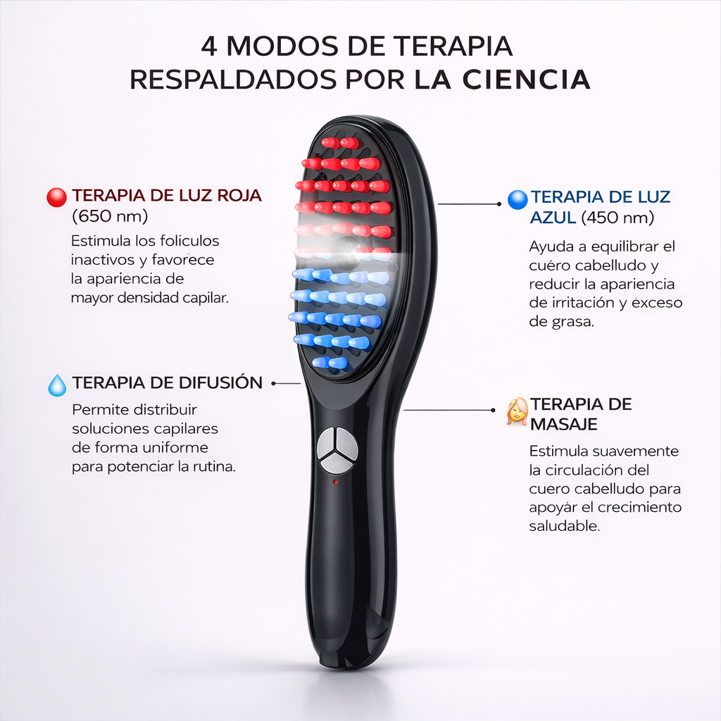Las cerdas masajean el cuero cabelludo, aumentando flujo sanguíneo. Más oxígeno + más nutrientes = folículos más activos.